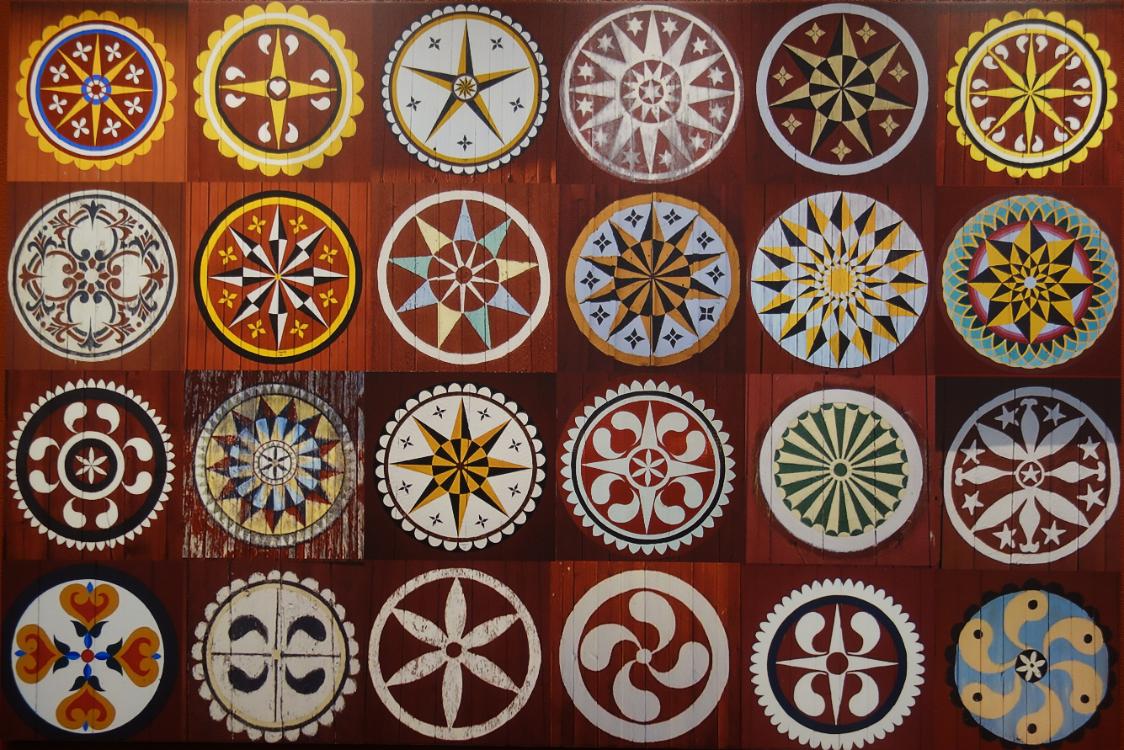 The sharp-pointed stars and the flower and raindrop pattern are typically found in different regions. Neither have anything to do with warding off evil influences. There still are active barn star painters in the region but they are not used by Amish nor Mennonites. Barn stars are a "church people" (Lutheran and Reformed) thing.