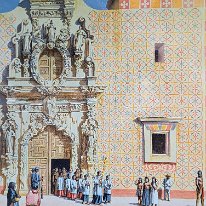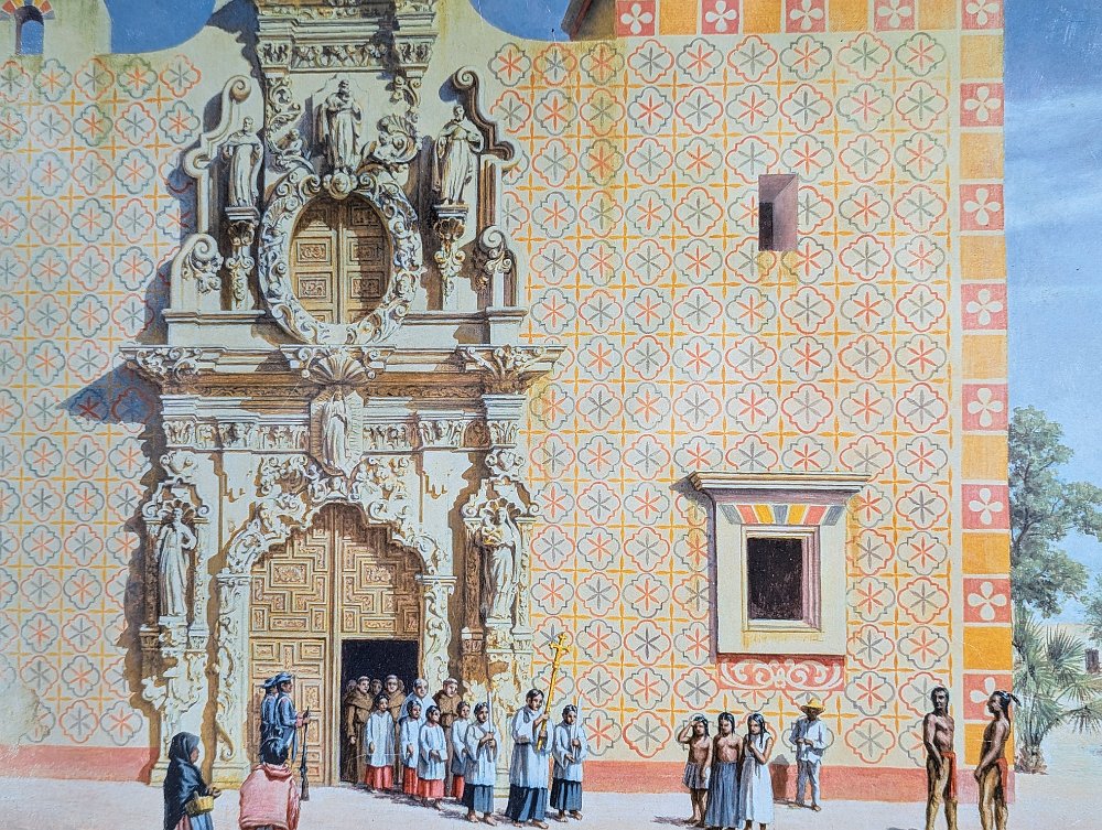 This is what the mission church looked like, based on that remaining surface covering, As with faded Victorian houses, we mistakenly assume that the dull colors…